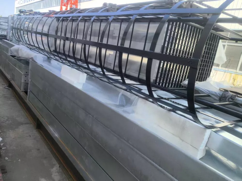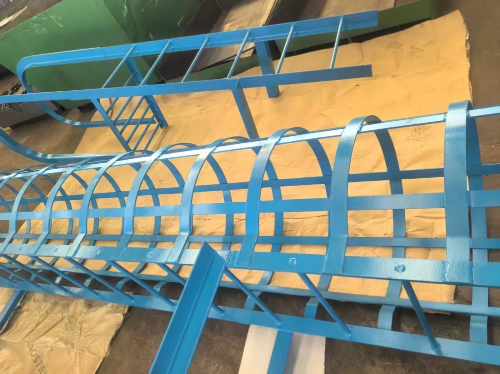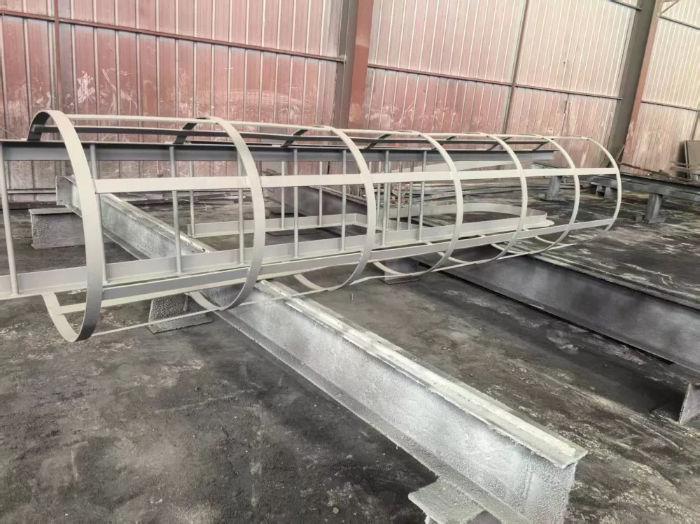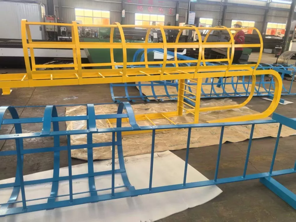 रेलिंगची स्थापना: 3 मीटरपेक्षा जास्त उंचीच्या पायऱ्यांसाठी, रेलिंग जमिनीपासून 2.5 मीटर वर स्थापित करणे आवश्यक आहे. रेलिंगचा व्यास 700 मिमी आणि 800 मिमी दरम्यान असावा. क्षैतिज रिंग 300 मिमी ते 450 मिमीच्या रिंगांमधील अंतरासह 16 मिमी गोल स्टीलच्या बनवल्या पाहिजेत. अनुलंब मजबुतीकरण पट्ट्या 12 मिमी गोल स्टीलच्या बनविल्या पाहिजेत, कमीतकमी चार बार समान अंतरावर असले पाहिजेत. सुरक्षा पिंजरा शिडी किंवा विश्रांतीच्या प्लॅटफॉर्मच्या शीर्षस्थानी सतत स्थापित करणे आवश्यक आहे. कनेक्टर आणि फिक्सिंग्ज